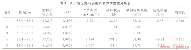 不同沉積亞相類型的頁巖中礦物組成結(jié)構(gòu)不同。龍馬溪組底部的深水陸棚相頁巖較其他層位的頁巖具有更高的脆性礦物含量。頁巖中石英的來源除了是細(xì)粒低變質(zhì)巖、風(fēng)化作用中粗顆粒的破碎、搬運(yùn)過程中的磨蝕以及黏土成巖過程中的石英之外,還包括生物成因蛋白石的重結(jié)晶[23]形成的生物成因石英礦物。龍馬溪組底部的頁巖主要來自于深水陸棚相沉積,深水陸棚相沉積中富含大量生物,含硅質(zhì)(如硅藻、放射蟲、海綿骨針等)及碳酸鹽礦物的(如有孔蟲和超微化石等)生物的富集提供了生物成因的脆性礦物,因此含有更高的脆性礦物。龍馬溪組頁巖有機(jī)質(zhì)越高,脆性礦物含量越高,具有較高的楊氏模量和較低的泊松比(表3),表明巖石脆性越好[13],越容易形成天然裂縫和人工誘導(dǎo)縫,可以有效改善儲(chǔ)層物性及提高壓裂的成功率。根據(jù)美國頁巖氣開采經(jīng)驗(yàn),產(chǎn)氣層段主要是硅質(zhì)或鈣質(zhì)含量較高的細(xì)粒巖層,純泥巖或頁巖段幾乎不產(chǎn)氣,頁巖產(chǎn)氣率隨著脆性礦物含量的增加而增加。壓裂梯度與頁巖中的黏土、石英和碳酸鹽巖含量有關(guān)[24]。在人工壓裂中富含硅質(zhì)的頁巖要比富含黏土質(zhì)頁巖更容易被壓裂[25]。