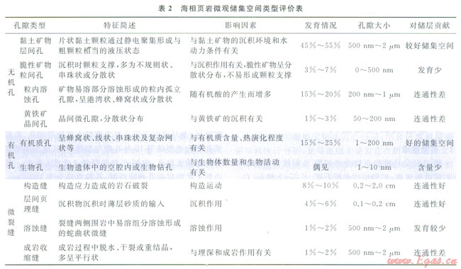 通過巖心、巖石顯微薄片和場發(fā)射掃描電鏡下觀察,龍馬溪組頁巖孔隙和微裂縫十分發(fā)育。據(jù)粗略觀察統(tǒng)計(jì),龍馬溪組頁巖主要發(fā)育黏土礦物層間孔、有機(jī)質(zhì)孔和構(gòu)造裂縫等10種孔隙與裂縫,按其成因類型劃分為基質(zhì)無機(jī)孔、有機(jī)孔和微裂縫3大類(表2)。其中黏土礦物層間孔連通性好,孔隙直徑介于100nm~2mm,黏土礦物層間孔占總孔隙的45%~55%;有機(jī)質(zhì)孔主要發(fā)育在富有機(jī)質(zhì)頁巖層段,孔隙直徑介于50~500nm的數(shù)量眾多,有機(jī)質(zhì)孔占總孔隙的15%~25%;構(gòu)造裂縫多數(shù)被膠結(jié)物充填,不具備儲(chǔ)集能力,頁巖氣的滲流通道主要為微裂隙[6-7],但方解石充填縫在人工壓裂中可重新開啟,提高頁巖儲(chǔ)層滲透性。