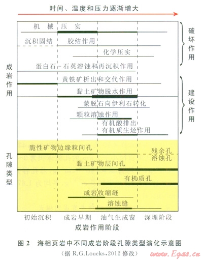 頁巖中孔隙的形成受多種因素控制,包括沉積原始礦物組成、結(jié)構(gòu)、構(gòu)造、有機(jī)質(zhì)含量、流體、水文條件以及沉積速率和埋藏深度[13]。其中,成巖演化作用是重要的影響因素,在不同成巖作用階段孔隙演化特征不同(圖2)。沉積初期主要是機(jī)械堆積成岡的粒間孔。隨著埋深及上覆地層壓力增大,松散沉積物固結(jié)成巖,地層中的流體快速排出,有機(jī)質(zhì)開始生物降解。粒間孔逐漸減少,塑性顆粒變形充填到粒間孔中加劇了孔隙的損失[13]。隨埋深進(jìn)一步增加,進(jìn)入大量生排烴階段(油氣生成窗),生烴后有機(jī)質(zhì)體積縮小以及氣體生成時(shí)體積膨脹造成有機(jī)質(zhì)中產(chǎn)生大量孔隙[14],同時(shí)在生烴的過程中產(chǎn)生大量的有機(jī)酸、CO2和水。易溶礦物顆粒(如方解石、長石)發(fā)生溶蝕作用形成溶蝕孔或溶蝕縫。同時(shí)黏土礦物發(fā)生一系列成巖變化,以蒙脫石向伊利石(或綠泥石)的轉(zhuǎn)化最為重要。在這個(gè)變化過程中,伴隨著礦物結(jié)構(gòu)和化學(xué)組成的變化,析出大量層間水。由于黏土礦物脫水作用,形成了大量的黏土礦物層間孔和成巖收縮縫。有機(jī)酸溶解的鈣質(zhì)礦物和黏土礦物脫水析出的鈣質(zhì)礦物易在溶蝕縫、成巖收縮縫及層間頁理縫中形成鈣質(zhì)沉淀,微裂縫多被方解石充填。