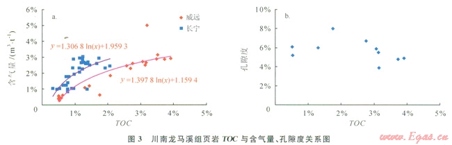 有機(jī)質(zhì)利于頁巖氣的吸附[15],有機(jī)質(zhì)含量越高吸附氣量越大(圖3-a),同時(shí)有機(jī)質(zhì)還有利于孔隙的形成[16]。有機(jī)質(zhì)孔的形成是在油氣生成過程中,有機(jī)質(zhì)體積縮小及氣體體積膨脹[17-18],并隨著地溫的升高及熱成熟度的增加隨之增多[12,19]。有研究發(fā)現(xiàn),在熱裂解作用下,有機(jī)質(zhì)損失35%可形成4.9%的凈有效儲(chǔ)集空間[20]。但有機(jī)質(zhì)豐度與頁巖孔隙度并不存在相關(guān)關(guān)系(圖3-b),這與有機(jī)質(zhì)孔之間相互連通性較差有關(guān)。