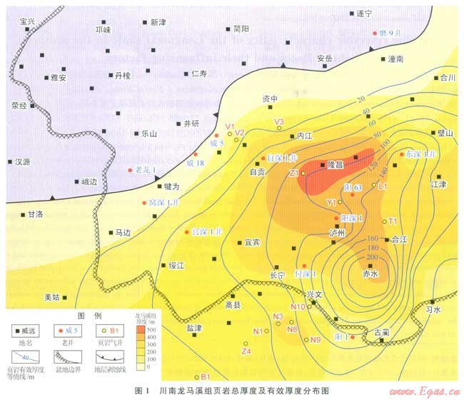 通過對川南地區(qū)鉆井巖心分層,結(jié)合區(qū)域地層調(diào)研資料統(tǒng)計(jì)分析,龍馬溪組主要發(fā)育在黔中隆起以北、川中隆起以南的較深水的非補(bǔ)償性缺氧環(huán)境中。受黔中古隆起的影響,在南部靠近古隆起邊緣的地區(qū)沉積厚度較薄,向北東方向厚度增大,處于沉積中心附近的頁巖厚度最大。在川中古隆起,龍馬溪組受地層抬升遭受剝蝕,在靠近古隆起邊緣的地區(qū)富含有機(jī)質(zhì)頁巖厚度較薄,向南東方向厚度增大。龍馬溪組整體厚度雖然較大,但有利層段厚度并不大(圖1)。