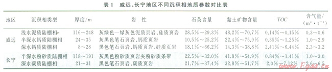 頁巖沉積物源及沉積相的差異,造成在區(qū)域上礦物組成的差異較大。長寧地區(qū)的深水陸棚相脆性礦物含量相對威遠(yuǎn)地區(qū)高一些,平均在75.9%~84.3%,其中石英含量介于21.7%~37.4%,含氣量相對較高,主要分布在2.6~6.5m3/t。而威遠(yuǎn)地區(qū)的深水陸棚相頁巖脆性礦物含量為21.3%~66.6%,石英含量介于18.1%~66.2%,含氣量為2.3~3.2m3/t。半深水陸棚相頁巖的礦物組成含量規(guī)律與深水陸棚相基本相同,長寧地區(qū)半深水陸棚頁巖的脆性礦物含量要比威遠(yuǎn)地區(qū)略高,平均在37.4%~58.2%,其中石英含量介于22.5%~32.0%,具有較高的含氣性,含氣量介于1.0~3.0m3/t。而威遠(yuǎn)地區(qū)的深水陸棚相頁巖脆性礦物含量在18.1%~31.2%,石英含量介于l0.5%~25.2%,含氣量介于1.0~2.9m3/t,含氣性與長寧地區(qū)大致相當(dāng)。淺水陸棚相只發(fā)育在威遠(yuǎn)地區(qū),長寧地區(qū)缺失。威遠(yuǎn)地區(qū)的淺水陸棚主要為泥質(zhì)沉積物源,泥質(zhì)含量極高,脆性礦物含量較少,僅有29.3%~31.8%,其中石英含量為28.5%~29.3%。