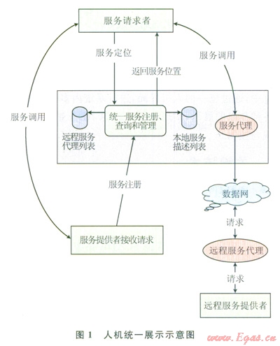 人機(jī)界面中的應(yīng)用以插件方式集成到系統(tǒng)中,控制臺(tái)負(fù)責(zé)實(shí)現(xiàn)界面集成管理功能。人機(jī)應(yīng)用通過服務(wù)接口層的服務(wù)代理與后臺(tái)服務(wù)進(jìn)行交互,服務(wù)代理提供了訪問后臺(tái)服務(wù)的接口,其主要功能是接收人機(jī)應(yīng)用的服務(wù)請(qǐng)求并將請(qǐng)求通過服務(wù)總線發(fā)送給后臺(tái)服務(wù),然后接收服務(wù)應(yīng)答并返凹給人機(jī)應(yīng)用。服務(wù)代理屏蔽了訪問服務(wù)的細(xì)節(jié),使應(yīng)用元需關(guān)心服務(wù)的具體部署信息以及訪問過程,因此有很好的服務(wù)訪問透明性。