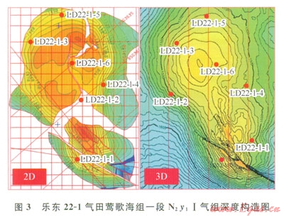 樂東22-l氣田三維地震解釋與二維解釋的構(gòu)造認(rèn)識發(fā)生了較大變化,以N1y2Ⅰ,工氣組為例,原二維資料解釋存在“Y”形斷層,但在三維資料解釋后斷層并不存在(圖3)。另外,三維地震解釋后部分主力氣組的構(gòu)造高點(diǎn)和幅度也發(fā)生了明顯的變化。為了減少構(gòu)造對氣田開發(fā)的影響,進(jìn)行了儲層精細(xì)描述,并以此來優(yōu)選井位和指導(dǎo)隨鉆井軌跡調(diào)整,為氣田開發(fā)成功實(shí)施奠定了基礎(chǔ)。