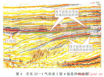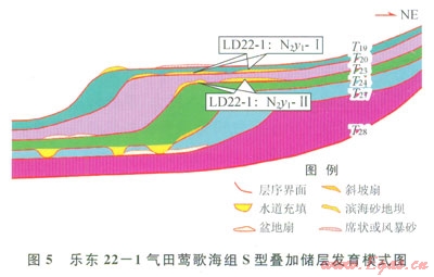 樂東22-1氣田主物源來自北東方向的海南島,為發(fā)育在陸架濱 淺海背景下,受沉積坡折控制的灘壩復(fù)合體沉積。儲層的形成,與海平面短期快速升降、強(qiáng)制性海退背景下形成的4級層序有關(guān)。4級層序界面以類工型界面為主,層序結(jié)構(gòu)主要表現(xiàn)為前積型特征,頂積層較薄(圖4)。S型疊加4級層序的頂積層可形成良好的儲集層,在沉積坡折以下多以淺海相泥巖、泥質(zhì)粉砂巖為主,儲層不發(fā)育(圖5)。準(zhǔn)確把握層序形成機(jī)制和疊加樣式[7-8],可以有效地預(yù)測和把握有利儲層的分布,減少儲層預(yù)測上的失誤,降低風(fēng)險(xiǎn)。通過對儲層的精細(xì)描述,刻畫有利砂體的展布,指導(dǎo)生產(chǎn)井的部署和井位優(yōu)化。