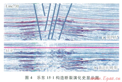 樂東l5-1構(gòu)造底辟的活動[8]分為兩個期次,導(dǎo)致斷層的發(fā)育也分為兩個期次。第一個活動期次是在新近系晚期,在第四紀(jì)前結(jié)束;因此,受本期底辟活動影響而發(fā)育的斷層組在新近紀(jì)以后也基本停止活動(圖4-b),該組斷層走向近似南北向(圖3);到第四紀(jì)早期,底辟活動加劇,發(fā)育更多斷層且斷距較之前發(fā)育的斷層增大(圖4-a);第四紀(jì)中晚期以后,泥底辟活動漸趨減弱或停滯,斷層活動也基本停止。第四紀(jì)發(fā)育的斷層以穹隆背斜的中心為圓點(diǎn),向四周放射狀分布,且均為正斷層。南北向的斷層由于形成時間相對較早,被后期近東西向的斷層切割。