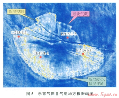 研究認(rèn)為[9]:在泥底辟活動過程中發(fā)育的斷層,由于塑性流體的活動,造成斷層泥在斷面上的涂抹較為均勻,而大幅提升了斷層的側(cè)向封堵能力。地震資料顯示并經(jīng)鉆井資料所證實(shí),放射狀分布的斷層將樂東氣田平面上分隔多個氣藏,背斜北部各斷塊氣藏間的氣水界面不同、氣體的組分也存在差異,這樣的氣藏分布導(dǎo)致了開發(fā)井的動用效率低,難以提高氣田開發(fā)的采收率。在背斜南部l、3、4井區(qū)從地震屬性平面圖分析應(yīng)該屬同一氣藏,且利用常規(guī)資料和方法解釋得到的斷層分布圖也顯示,各塊低部位的氣藏是連通的,基本可以判斷為同一氣藏(圖5)。但l、3、4井資料顯示各井的氣體組分差異較大,其中1井CO2含量16.7%、4井CO2含量70.4%、3井CO2含量79.7%,難以劃歸為同一氣藏。因此,推測還存在一些常規(guī)手段和方法無法解釋的小斷層或微斷層將背斜南部分隔成至少3個獨(dú)立氣藏,而這些可疑微、小斷層的不確定性就嚴(yán)重影響對氣田的認(rèn)識和生產(chǎn)井的合理部署。
