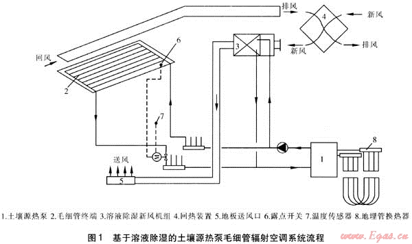 基于溶液除濕的土壤源熱泵毛細(xì)管輻射空調(diào)系統(tǒng)發(fā)展很快[1~5],系統(tǒng)流程見圖1。采用溫濕度獨(dú)立處理原理控制室內(nèi)熱濕環(huán)境:向室內(nèi)送入經(jīng)溶液除濕新風(fēng)機(jī)組處理后的干燥空氣控制濕度和滿足新風(fēng)需求,采用獨(dú)立的毛細(xì)管輻射空調(diào)系統(tǒng)消除顯熱控制室內(nèi)溫度,從而全面調(diào)節(jié)室內(nèi)熱濕環(huán)境。用土壤源熱泵作為系統(tǒng)的冷源,采用地板送風(fēng)口送入新風(fēng),吸收室內(nèi)余熱余濕的排風(fēng)與新風(fēng)進(jìn)行全熱交換。毛細(xì)管輻射空調(diào)系統(tǒng)由毛細(xì)管終端、獨(dú)立新風(fēng)系統(tǒng)、控制系統(tǒng)組成: