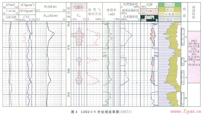 圖4顯示LD22-1-Y井963~985m段測(cè)井定量計(jì)算烴類(lèi)氣含量為75%左右,測(cè)試證實(shí)該層甲烷含量為81%。通過(guò)鶯歌海盆地l5口井19個(gè)層位測(cè)井計(jì)算烴類(lèi)氣含量與實(shí)測(cè)結(jié)果對(duì)比,在統(tǒng)計(jì)的l9層中,絕對(duì)誤差在20%以?xún)?nèi)的層有l5層,占79%;絕對(duì)誤差在10%以?xún)?nèi)的層有l2層,占63%[13]。表明該定量方法能較為有效地計(jì)算烴類(lèi)氣含量,從而達(dá)到區(qū)分烴類(lèi)氣與非烴氣的目的。