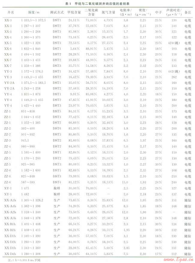 烴類(lèi)氣與二氧化碳?xì)鈱釉跍y(cè)井曲線上的響應(yīng)特征與油、水層有較明顯的區(qū)別,而它們兩者之間的差異卻較小,這是造成用測(cè)井資料區(qū)分甲烷和二氧化碳困難的根本原因。但通過(guò)對(duì)二者理論上測(cè)井響應(yīng)值的研究可知,兩者還是存在一定的差別,因而兩種氣體在測(cè)井曲線上必定存在或多或少的差異,這是用測(cè)井資料定性、定量區(qū)分烴類(lèi)氣與二氧化碳?xì)獾幕A(chǔ)[4]。