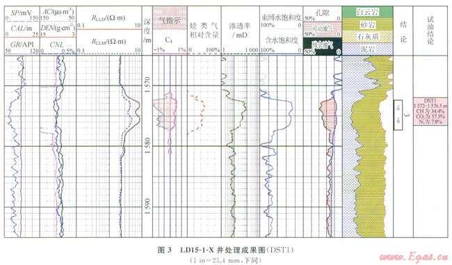 圖3顯示LDl5-1-X井1572~1577m段第2道中子密度出現(xiàn)交會(huì),第3道電阻率增大,第5道孔隙度差、比值識(shí)別法出現(xiàn)明顯的氣層“包絡(luò)”特征,第8道測(cè)井計(jì)算的含水飽和度與束縛水飽和度幾乎重合,含水飽和度大致為30%,第6道為該方法定量計(jì)算出的烴類(lèi)氣相對(duì)含量,大概在40%左右,DST測(cè)試證實(shí)該層甲烷含量為34.4%,測(cè)試的結(jié)果與定量計(jì)算的結(jié)果相近。