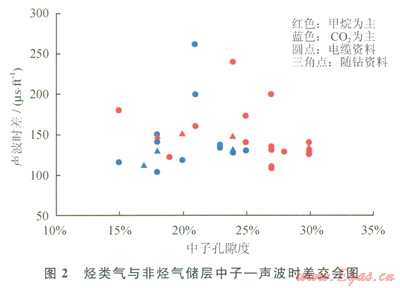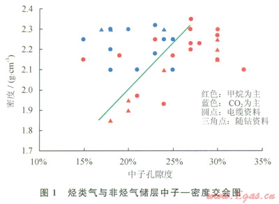 根據(jù)上述分析,采用交會(huì)圖技術(shù)研究了兩者在測(cè)井響應(yīng)上的差別。在樂(lè)東l5-1/22-1研究區(qū)選取了經(jīng)測(cè)試、電纜測(cè)試取樣或試生產(chǎn)證實(shí)含量相對(duì)比較高的甲烷或二氧化碳層段(表1),并定義甲烷含量高于50%的氣層為以甲烷為主的氣層,否則為以非烴為主(CO2為主)的氣層,然后利用這些層段的測(cè)井資料分別作出了密度一中子、密度一聲波交會(huì)圖(圖1、2)。從圖l、2中可以看出:烴類(lèi)氣與二氧化碳?xì)怏w在測(cè)井響應(yīng)值上是存在一定差別的,從而可以通過(guò)這種差異來(lái)區(qū)分烴類(lèi)氣與二氧化碳?xì)鈱?sup>[10]。