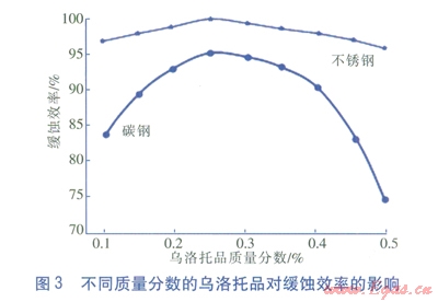 在質(zhì)量分?jǐn)?shù)為5%的羥基亞乙基二膦酸清洗溶液中,分別加入不同質(zhì)量分?jǐn)?shù)的烏洛托品緩蝕劑,然后按照3.3.1方法分別測定不銹鋼及碳鋼標(biāo)準(zhǔn)試片的腐蝕速率,由此計算出烏洛托品緩蝕劑對金屬不銹鋼及碳鋼的緩蝕效率,實驗結(jié)果見圖3。