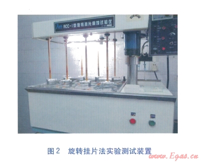 參照GB/T l8175—2000《水處理劑緩蝕性能的測定——旋轉(zhuǎn)掛片法》規(guī)定的方法,按公式(1)及公式(2)分別計算金屬的腐蝕速率及緩蝕劑的緩蝕效率。旋轉(zhuǎn)掛片法的實驗測試裝置見圖2。