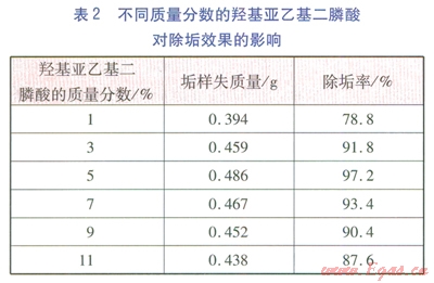 實驗方法采用失重法,具體方法步驟如下:用孔徑8mm的篩子篩選顆粒均勻的大理石(CaCO3)作為垢樣,使用BT224S型電子分析天平準(zhǔn)確稱量0.5g垢樣數(shù)組,分別放入盛有100mL不同羥基亞乙基二膦酸質(zhì)量分?jǐn)?shù)的清洗液的試管中,在溫度為30℃的501BS型恒溫水浴鍋中靜置10h后,用布氏漏斗進(jìn)行真空抽濾,將殘余的垢樣放入768-3型遠(yuǎn)紅外干燥箱中在50℃下烘干至恒重,最后放入玻璃下燥器中冷卻至室溫后于BT224S型電子分析天平上再次稱重。根據(jù)公式(3)計算清洗劑的除垢率并將實驗結(jié)果列于表2。