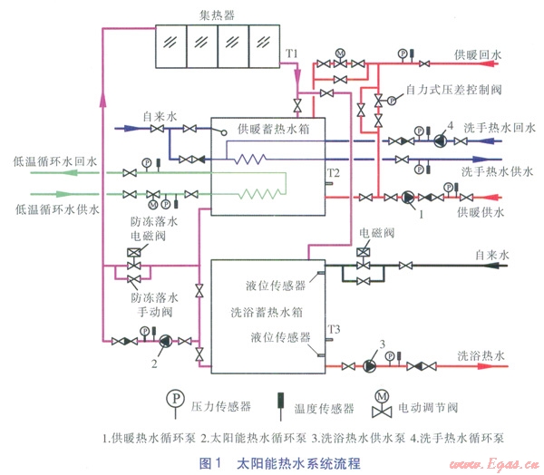 太陽(yáng)能熱水系統(tǒng)由集熱器、循環(huán)泵、供暖蓄熱水箱、洗浴蓄熱水箱、輔助熱源(低溫循環(huán)水供暖系統(tǒng))、控制系統(tǒng)組成,流程見(jiàn)圖l。