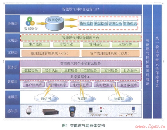 “智能燃?xì)饩W(wǎng)”涵蓋的內(nèi)容非常廣泛,包含廣泛的物聯(lián)網(wǎng)感知體系,有線、無線、自組等多樣化的網(wǎng)絡(luò)通訊體系,基于共享數(shù)據(jù)中心的,能夠為全企業(yè)提供數(shù)據(jù)和業(yè)務(wù)服務(wù)的“企業(yè)私有云”體系,融合管網(wǎng)完整性管理、生產(chǎn)調(diào)度管理、應(yīng)急指揮管理、客戶關(guān)系管理等核心業(yè)務(wù)的企業(yè)運(yùn)營標(biāo)準(zhǔn)化體系,頂層應(yīng)用數(shù)據(jù)倉庫、數(shù)據(jù)挖掘的決策分析體系等等。圖l是智能燃?xì)饩W(wǎng)建設(shè)總體架構(gòu)。
