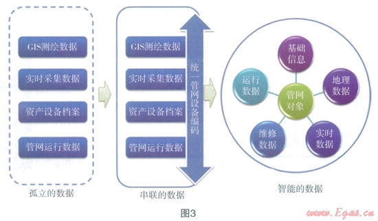 如何才能把不同種類的數(shù)據(jù)利用物理或者邏輯的方式集成起來?答案是通過統(tǒng)一的管網(wǎng)設(shè)備設(shè)施編碼,它同樣是智能燃?xì)饩W(wǎng)標(biāo)準(zhǔn)化建設(shè)體系里面的重要內(nèi)容。北京燃?xì)饧瘓F(tuán)從多年前就開始管網(wǎng)設(shè)備設(shè)施和物資體系的標(biāo)準(zhǔn)化工作,如存GIS地理信息系統(tǒng)里面就已經(jīng)采用了l5位的統(tǒng)一管網(wǎng)編碼,但大部分業(yè)務(wù)系統(tǒng)設(shè)備設(shè)施的編碼體系還不完全一致,需要轉(zhuǎn)換或者對照才能把這些業(yè)務(wù)數(shù)據(jù)關(guān)聯(lián)起來。圖3足數(shù)據(jù)從串聯(lián)到完全關(guān)聯(lián)的過程。