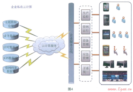數(shù)據(jù)的集成最終是為了數(shù)據(jù)的有效利用和業(yè)務(wù)的集成,智能燃?xì)饩W(wǎng)企業(yè)私有云需要完成云計算PAAS層研發(fā)建設(shè)工作(IAAS層由于GIS數(shù)據(jù)和實(shí)時數(shù)據(jù)庫的相對獨(dú)立以及專業(yè)性,并不需要在硬件層面上完全虛擬化構(gòu)建),為業(yè)務(wù)系統(tǒng)提供各類標(biāo)準(zhǔn)化計算與服務(wù),如圖4所示。