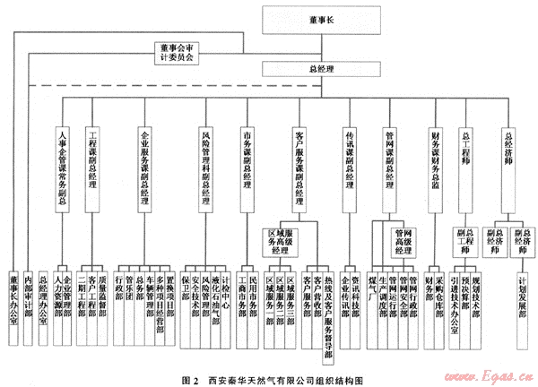 架構(gòu)重組后的部門設(shè)置以“使客戶滿意的流程”為中心,把同類業(yè)務(wù)整合到一起,這樣可以強化專業(yè)化管理,優(yōu)化專業(yè)技術(shù);優(yōu)化人力資源,減少勞動定員,避免同一專業(yè)崗位工作忙閑不均的問題;減少開資。降低消耗。提高極具設(shè)備、原材料、能源、技術(shù)等各種資源的綜合利用水平。重組后的西安秦華天然氣有限公司組織結(jié)構(gòu)圖如圖2所示。