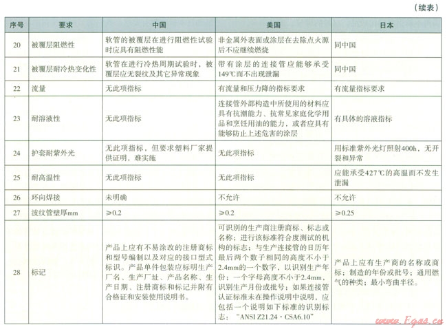 (6)對耐溶液性我們的標(biāo)準(zhǔn)沒有明確要求,美國和日本標(biāo)準(zhǔn)都有要求,我們需要根據(jù)我國的實(shí)際制定相關(guān)的要求,包括耐紫外光,建議在以后標(biāo)準(zhǔn)修訂時(shí),能夠參考日本的標(biāo)準(zhǔn)制定適合我國國情的相關(guān)要求,如耐溶液性除了常用的油鹽醬酷外,包括清潔用的除油劑和洗滌劑,耐紫外光可以直接采用日本標(biāo)準(zhǔn)的相關(guān)部分。因?yàn)橹袊乃芰显牧仙a(chǎn)比較混亂,塑料的成分沒有統(tǒng)一的標(biāo)準(zhǔn),而且檢測它的化學(xué)成分難度比較大,尤其足用舊的塑料回用,性能明顯下降,但是很難識別,原材料廠家的檢測報(bào)告都是通過標(biāo)準(zhǔn)樣塊送檢,沒有可比性,我們應(yīng)盡快制定相關(guān)的技術(shù)指標(biāo)及試驗(yàn)方法,針對波紋軟管成品進(jìn)行檢測。