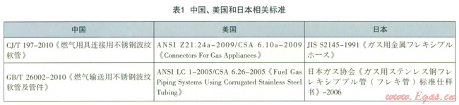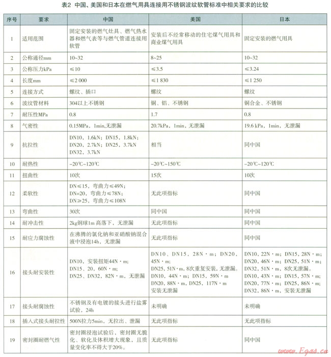 最早的CJ/T l97—2004《燃?xì)庥貌讳P鋼波紋軟管》標(biāo)準(zhǔn)把燃具用連接軟管和輸送管道用軟管放在了一起,技術(shù)性能要求也基本一致,在后來的實(shí)際應(yīng)用中出現(xiàn)了問題:輸送管道用軟管在疲勞試驗(yàn)方面的彎曲性能要求不需要很高,但是對波紋管管體的強(qiáng)度和使用壽命要求相應(yīng)更高;而燃具連接用軟管需要柔軟性好,對彎曲和扭曲的疲勞壽命也要求更高。同時(shí),經(jīng)過國內(nèi)廠家的努力,我們的設(shè)計(jì)水平和制造工藝也大大縮小了和美國、日本的同類產(chǎn)品的差距,而美國和日本對這兩種產(chǎn)品有不同的標(biāo)準(zhǔn),見表1。在中國市政工程華北設(shè)計(jì)研究總院相關(guān)領(lǐng)導(dǎo)和專家的努力下,按照產(chǎn)品的使用功能把一個(gè)標(biāo)準(zhǔn)分成兩個(gè)標(biāo)準(zhǔn),是非常及時(shí)和必要的。