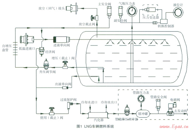 LNG車輛的燃料系統(tǒng)完全不同于柴油車,這是由LNG燃料本身的物理特性所決定的,LNG車燃料系統(tǒng)主要由LNG鋼瓶、汽化器、電磁閥、穩(wěn)壓閥、過(guò)濾器等構(gòu)成,部分設(shè)置緩沖罐;柴油車燃料系統(tǒng)主要由燃油箱、高壓油泵、油嘴、調(diào)速器,以及一些輔助裝置構(gòu)成。目前,車載LNG燃料系統(tǒng)由低溫設(shè)備供應(yīng)商直接供應(yīng)及提供售后服務(wù),常見(jiàn)的低溫設(shè)備供應(yīng)商包括查特、中集圣達(dá)因、張家港富瑞等。圖1為LNG車輛的燃料系統(tǒng)簡(jiǎn)圖。