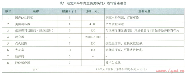 據(jù)大概統(tǒng)計(jì),l00余臺(tái)LNG公交,投用大半年來(lái),天然氣燃料系統(tǒng)更換的設(shè)備材料費(fèi)用總共約2萬(wàn)元(不包括LNG鋼瓶,鋼瓶本身問(wèn)題),該部分費(fèi)用均由天然氣燃料系統(tǒng)設(shè)備供應(yīng)商承擔(dān)(售后服務(wù)約定2年)。這些LNG車輛燃料系統(tǒng)出現(xiàn)問(wèn)題較多的設(shè)備為低壓燃料切斷閥的感應(yīng)線圈、液位感應(yīng)器、點(diǎn)火線圈、火花塞等等。
