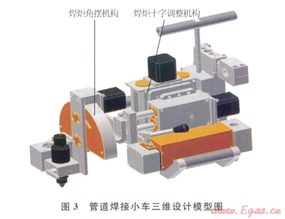 焊接小車主要由焊炬角擺機(jī)構(gòu)與焊炬十字調(diào)整機(jī)構(gòu)構(gòu)成(圖3)。其中,焊炬角擺機(jī)構(gòu)可實(shí)現(xiàn)焊炬最佳的角擺角度和擺動(dòng)頻率,有效避免焊接過(guò)程中產(chǎn)生未熔缺陷;焊炬十字調(diào)整機(jī)構(gòu)可實(shí)現(xiàn)焊炬上下位置的調(diào)整與相對(duì)于焊縫寬度的左右位置調(diào)整,以滿足管道焊縫不同位置焊絲與管壁的間距要求及寬度要求。