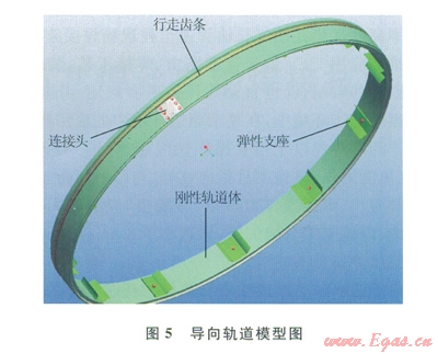 導(dǎo)向軌道采用分體式環(huán)形結(jié)構(gòu),軌道由2塊半圓弧軌道通過(guò)連接頭和鎖緊把手連接而成,其上設(shè)有齒條,以實(shí)現(xiàn)與齒輪的動(dòng)力傳動(dòng)(圖5)。