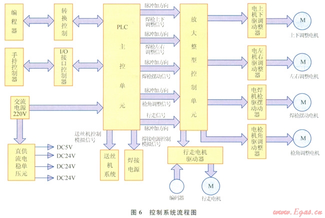 通過(guò)手持控制器可選擇具體的焊接工序及各種控制按鈕,經(jīng)I/O總線進(jìn)行控制命令的發(fā)送(圖6)。所有焊接參數(shù)均寫入編程器中,并通過(guò)轉(zhuǎn)換控制單元傳輸。信號(hào)最終傳輸給PLC主控單元進(jìn)行處理,經(jīng)放大給整形單元整形后傳輸給各電機(jī)驅(qū)動(dòng)器,進(jìn)而對(duì)相應(yīng)電機(jī)進(jìn)行運(yùn)動(dòng)控制。