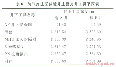榆林南儲氣庫注采試驗井榆A和榆B采用井下懸掛壓力汁測壓完井管柱。榆A井采用Æ114.3mm油管,完井管柱全井段最小內徑67.7mm(RN坐落短節(jié)處);榆B井采用Æl39.7mm油管,完井管柱全井段最小內徑112.9mm(RN坐落短市處)。完井工具入井前測試合格,完井管柱下入施工順利,封隔器一次坐封、試壓及功能測試正常。完井后鋼絲作業(yè)和連續(xù)油管儲層改造管柱通過順暢。