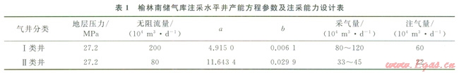 由于儲層非均質性強,氣井產(chǎn)能存在差異,榆林南儲氣庫注采井按照采氣量2類井(表1)設計。氣井二項式產(chǎn)能方程[2]如下:
