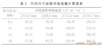 高速流動的氣體在金屬表面上運動,在氣體雜質機械磨損與腐蝕介質的共同作用下,會使油管腐蝕加速。實踐表明,氣體流速超過21.3m/s時,管柱沖蝕趨于嚴重。儲氣庫注采井運行過程中井口壓力為整個井筒壓力分布的最低點,沖蝕分析選擇井口為研究點。表2是不同油管在對應井口壓力下的沖蝕流量[6-8]。
