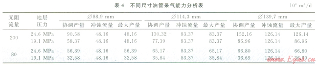 如表4所示,無阻流量為200×104m3/d時,采用Æ139.7mm可以滿足86×104~126×104m3/d的采氣要求;無阻流量為80×104m3/d時,采用Æll4.3mm可以滿足35×104~65×104m3/d的采氣要求。