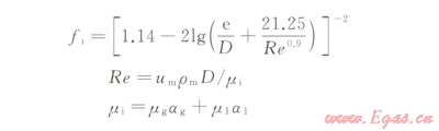 式中fi為氣液界面摩擦系數(shù),無因次;D為管道當量直徑,m;Re為雷諾數(shù);mi為混合物黏度,Pa·s;mg為氣相黏度,Pa·s;ag為空泡率;m1為液相黏度,Pa·s;a1為持液率;CD為阻力系數(shù),無量綱,是Re的函數(shù):rm為混合物真實密度,kg/m3;um為氣液混合速度,m/s;當um繼續(xù)增大,該平衡狀態(tài)將被打破,巖屑開始運移;ui為巖屑顆粒床平均摩阻系數(shù),無因次;e為巖屑顆粒堆積空隙程度,無因次;a/b與巖屑堆積程度相關,無因次。