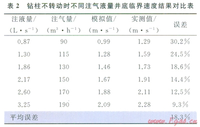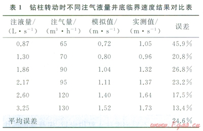 臨界流速是指巖屑發(fā)生躍移時的最低混合物流速。在達到臨界攜巖的狀態(tài)下,實測了氣液兩相混合真實攜巖臨界速度,再與多相流數(shù)值模擬軟件計算出的臨界混合速度對比,得出兩者的誤差。表l、2為鉆柱轉動和鉆柱不轉動時的結果對比。