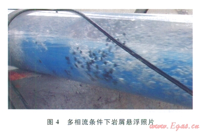 懸浮是巖屑顆粒運動的重要方式,引起巖屑顆粒懸浮的主要因素是紊動作用(圖3)。懸浮運動的形式是隨鉆井液漂流,懸浮運動時受到2種力的作用:①重力,使巖屑顆粒向下井壁沉降;②氣液兩相流推動力,使巖屑顆粒沿井筒向下游運動。巖屑顆粒向下游運動的速度與氣液兩相流速度有關,巖屑顆粒輸送量可間接代表巖屑顆粒向下游運動的速度,流量越大,可帶走的巖屑顆粒量也越多。懸浮顆粒在沉降過程中被渦流帶回上層,使巖屑顆粒上下漂移,沉降速度變慢,巖屑懸浮照片如圖4所示。