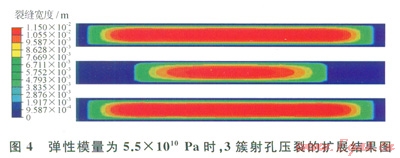 儲層的彈性模量增大,壓裂裂縫寬度降低,這樣會降低射孔簇間的干擾,增加中間射孔簇壓裂裂縫的長度。圖4所示的是3簇射孔、彈性模量為5.5×1010Pa時的裂縫擴(kuò)展情況,圖2-b所示的是3簇射孔、彈性模量為3.5×1010Pa時的裂縫擴(kuò)展情況,可以發(fā)現(xiàn):儲層彈性模量增大2.0×1010Pa時,中間射孔簇的裂縫長度增加了53.0m,中間裂縫形成了有效裂縫。
