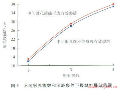 假設(shè)中間射孔簇形成的壓裂裂縫長度達(dá)到兩端裂縫的一半以上,認(rèn)為中間裂縫形成了有效裂縫。不同射孔簇數(shù)、簇間距條件下的裂縫擴(kuò)展情況如圖3所示,從圖3可以看出:射孔簇數(shù)增加,能形成有效裂縫的極限間距增加,且增加幅度較大;射孔簇數(shù)為2簇,極限干擾距離為13.0m;射孔簇數(shù)增加到4簇,極限十?dāng)_距離增加到38.0m。