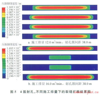 圖5所示的是4簇射孔、射孔簇間距為38.0m,施工排量分別為l2.0m3/rain和l6.0m3/min時的裂縫擴(kuò)展情況,施工排量增大4.0m3/min,中間裂縫的長度發(fā)生了明顯變化;施工排量為l6.0m3/min、4簇射孔條件下,中間射孔簇?zé)o法形成有效裂縫。