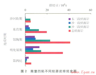 南堡凹陷3套烴源巖熱演化程度有所差異,因此不同烴源巖的主要排烴時期和排烴量也存在差異(圖2)。沙三段烴源巖發(fā)生大規(guī)模排烴的時間較早,在沙河街組沉積期就發(fā)牛一定規(guī)模的排烴過程,東營組沉積期以來發(fā)生了大規(guī)模的排烴過程;沙一段和東三段烴源巖發(fā)生大規(guī)模排烴的時間較晚,其大規(guī)模排烴的時間主要集中在館陶組沉積期以來。總的來說東營期、館陶期和明化鎮(zhèn)期是主要的排烴期,且3套烴源巖均只有1次排烴高峰期,說明南堡凹陷只有1次主要成藏期。且至今仍在成藏過程中,這和前人利用烴類流體包裹體均一化溫度分析結(jié)果一致。南堡凹陷發(fā)生油氣充滓過程的時間跨度大,從東營組沉積時期至第四系沉積時期均有油氣成藏[20]。
