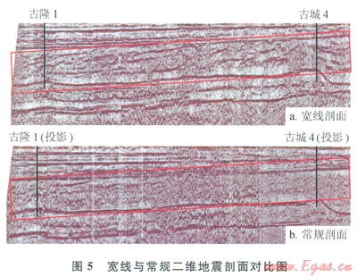 2008年首次在臺盆區(qū)沙漠腹地開展寬線攻關(guān),采集了2條共l47km的寬線,一條是古隆1—古城4井的連井剖面,一條是過古城6號構(gòu)造的近南北向剖面。寬線攻關(guān)目的有兩個:①尋找層間巖溶儲層的地震依據(jù);②降低三維地震部署風險。實施效果表明寬線攻關(guān)效果顯著,主要表現(xiàn)為資料品質(zhì)有較大程度改善,古城4與古隆地區(qū)油氣顯示層位大體相當(圖5),大大提高該區(qū)的地質(zhì)認識,為三維地震部署提供了依據(jù)。