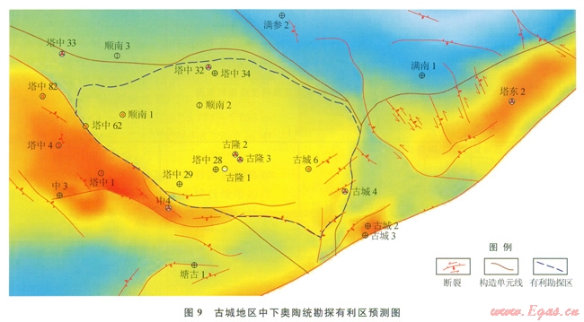 古城地區(qū)下古生界碳酸鹽巖具有良好的生儲蓋組合空間配置與有利的古構(gòu)造發(fā)育背景,石油地質(zhì)條件優(yōu)越。該中下奧陶統(tǒng)發(fā)育層間巖溶優(yōu)越,與卜覆奧陶系卻爾卻克組巨厚泥巖構(gòu)成優(yōu)質(zhì)儲蓋組合;且處于加里東期以來長期繼承性古隆起斜坡高部位,同時處于寒武系—中下奧陶統(tǒng)的盆地相優(yōu)質(zhì)烴源巖有利分布區(qū),可俘獲早期油氣與晚期裂解氣,成藏條件有利。古城6井的突破,證實了該區(qū)的勘探潛力,是繼塔中、塔北之后的又一個碳酸鹽巖勘探領域,古城地區(qū)下古生界碳酸鹽巖7000m埋深(海拔-6000m)可探面積約1.2×104km2,勘探前景廣闊(圖9)。
