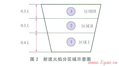 Palacios,Gomez Mares等學者[8-11]通過大量實驗,研究了高速射流火焰的火焰溫度和熱輻射特性,提出射流火焰按照表面溫度特性和表面熱輻射功率可將其分3個區(qū)域來分析(圖2):區(qū)域I是火焰底部到火焰整體長度的2/5處,區(qū)域Ⅱ是火焰整體長度2/5處至火焰整體長度7/10處,區(qū)域Ⅲ是指火焰整體長度7/10處到火焰頂。并將這種分區(qū)域理論應用到改進的固體火焰模型來計算射流火焰熱輻射。筆者按這個思路來將圓錐體平截頭模型中計算出的幾何形狀進行分區(qū)域,每個區(qū)域用1個輻射點源表示,輻射點源位于區(qū)域的正中央。