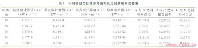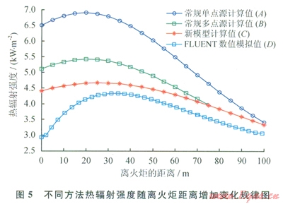 從圖5可以看出,4個計算結果值呈現(xiàn)出一樣的變化規(guī)律,在下風向距離,隨著與火炬距離的增加,熱輻射強度呈現(xiàn)先增加后減少的趨勢。在不同距離取四者數(shù)值進行對比,如表l所示,新模型計算結果與標準參考值之間的相對誤差除了在10m處為23.09%,其余在30m、50m、70m、90m處均低于l5%;常規(guī)單點源模型計算結果與標準參考值之間的相對誤差在不同距離處的波動較大,在10m處,相對誤差較火(大于80%),隨著距離的變大,相對誤差有減小的趨勢,但在各點始終均大于新模型與標準參考值之間的相對誤差;而與新模型取相同點源數(shù)的常規(guī)多點源計算結果與標準參考值之間的相對誤差相比較于單點源計算值減小了許多,但在70m范圍內(nèi)相對誤差仍遠大于新模型計算值,在70m范圍之外,常規(guī)多點源與標準參考值之間的相對誤差才達到可接受的l5%之內(nèi)??傮w來說,相比于與常規(guī)單點源和常規(guī)多點源計算結果,以數(shù)值模擬的結果為標準參照,新模型計算出的熱輻射強度有著更高的精度,同時計算復雜程度沒有提高很多,滿足工程使用的要求,可以在確定高架火炬安全距離得到很好的應用與推廣。