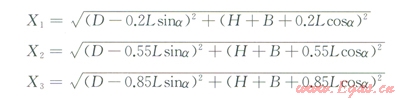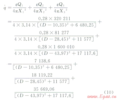 假設該目標物距高架火炬筒體水平距離為D,該目標物接收的熱輻射通量需疊加3個輻射點源在該目標點產(chǎn)生的總輻射熱通量(q),即