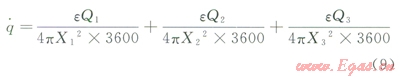 式中e為熱輻射率(輻射熱量與總熱量的比值);X1、X2、X3分別是3個區(qū)域輻射點源與目標物的距離,m。