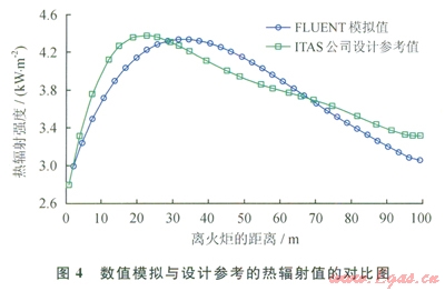 從圖4可以看出,在水平下風向的熱輻射分布,數(shù)值模擬結果與設計計算參考結果隨著距火炬距離增加的變化趨勢一致,都是隨著距火炬距離的增加呈現(xiàn)先增加后減小的趨勢。從具體的對比數(shù)值來看,在29m范圍內(nèi),設計參考值略大于FLUENT模擬值,其中最大誤差為5.8%;在29~68m區(qū)間范圍內(nèi),FLUENT模擬值略大于設計參考值,其中最大誤差為4.8%;在68~100m區(qū)間范圍內(nèi),設計參考值又略大于FLUENT模擬值,其中最大誤差6.2%。綜上所述,以ITAS公司設計參考值為標準,FLUENT的數(shù)值模擬結果與設汁參考值吻合得較好,在100m的空間范圍內(nèi),兩者的誤差均保持在10%以內(nèi)。即可以認為FLUENT數(shù)值模擬結果的精確性是滿足要求的。