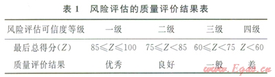 得出油氣管道風(fēng)險(xiǎn)評估質(zhì)量評價(jià)的總得分2后,就容易判斷最終整體上管道風(fēng)險(xiǎn)評估質(zhì)量的優(yōu)劣,從而為項(xiàng)目的驗(yàn)收和今后類似油氣管道風(fēng)險(xiǎn)評估工作的開展提供依據(jù)和參考借鑒。根據(jù)油氣管道風(fēng)險(xiǎn)評估質(zhì)量評價(jià)總得分的不同,一般而言可以將油氣管道風(fēng)險(xiǎn)評估的可信度劃分為4個(gè)等級,劃分標(biāo)準(zhǔn)如表l所示。